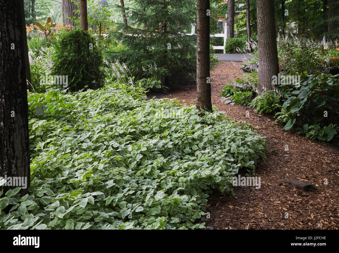 Cedar Mulch Path Bordered By Lamium Deadnettle Petasites Butterbur Mauve Flowering Hosta Plants Deciduous Evergreen Trees In Front Yard Garden Stock Photo Alamy